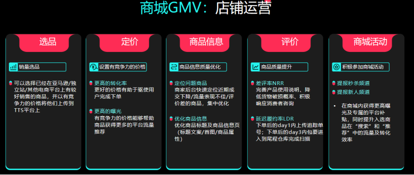 第一部分是来自于商城;其次最重要内容会分为短视频跟直播。目前而言,短视频流量来源跟GMV的占比会更高,不过今年官方会扶持直播部分,有能力、有条件,或已经在其他国家,国内电商有直播经验的商家,都可以在当前阶段开始布局直播。